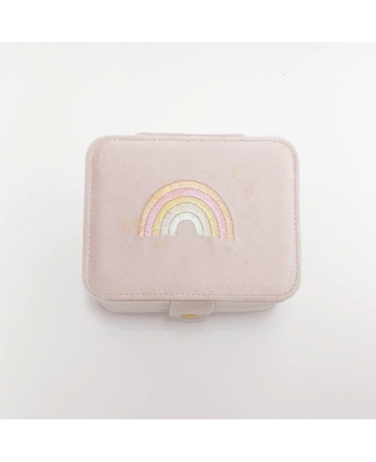 Dotée d'un magnifique arc-en-ciel brodé sur le dessus, cette boîte à bijoux a une fermeture à pression pour révéler quatre compartiments, une poche plaquée et un espace dédié pour insérer des boucles d'oreilles et des bagues.